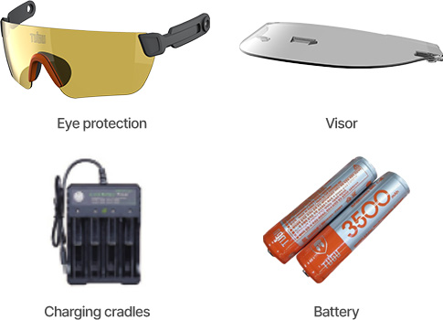 Various detachable options available, including eye protection, noise-canceling earplugs, and in-ear devices