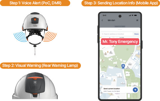 Phase 1: Voice Alert Dissemination Phase 2: Visual Alert Dissemination (Rear Warning Light) Phase 3: Location Information Transmission (Mobile App)