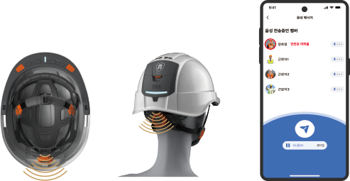안전모 뒷편 온습도 센서를 통해 작업장의 온습도를 측정하여 앱 및 통합관제 프로그램에 표시 설정값 초과시 온열손상 위험 경보