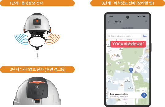 1단계 : 음성경보 전파 2단계 : 시각경보 전파(후면 경고등) 3단계 : 위치정보 전파(모바일 앱)