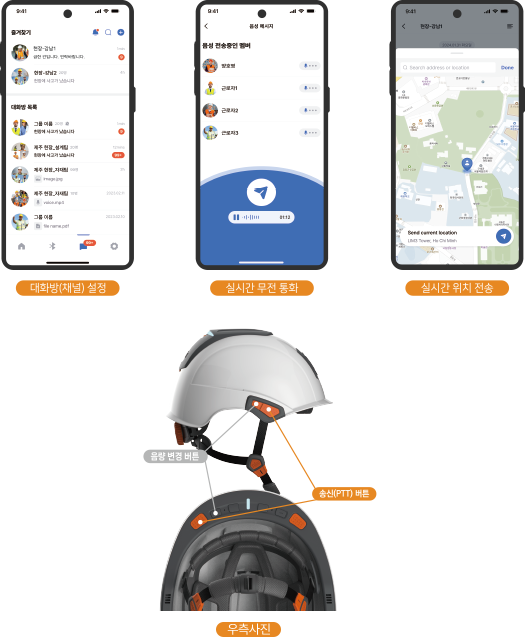 모바일 앱 에서 5개 즐겨 찾기 채널 설정 후 안전모 우측 스피커 아래의 버튼으로 채널 변경 및 무전 송신 가능