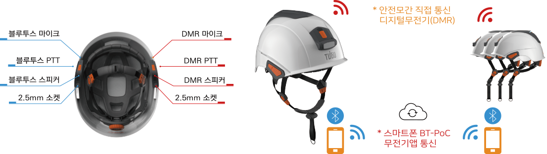 모바일 앱 에서 5개 즐겨 찾기 채널 설정 후 안전모 좌측 스피커 아래의 버튼으로 채널 변경 및 무전 송신 가능